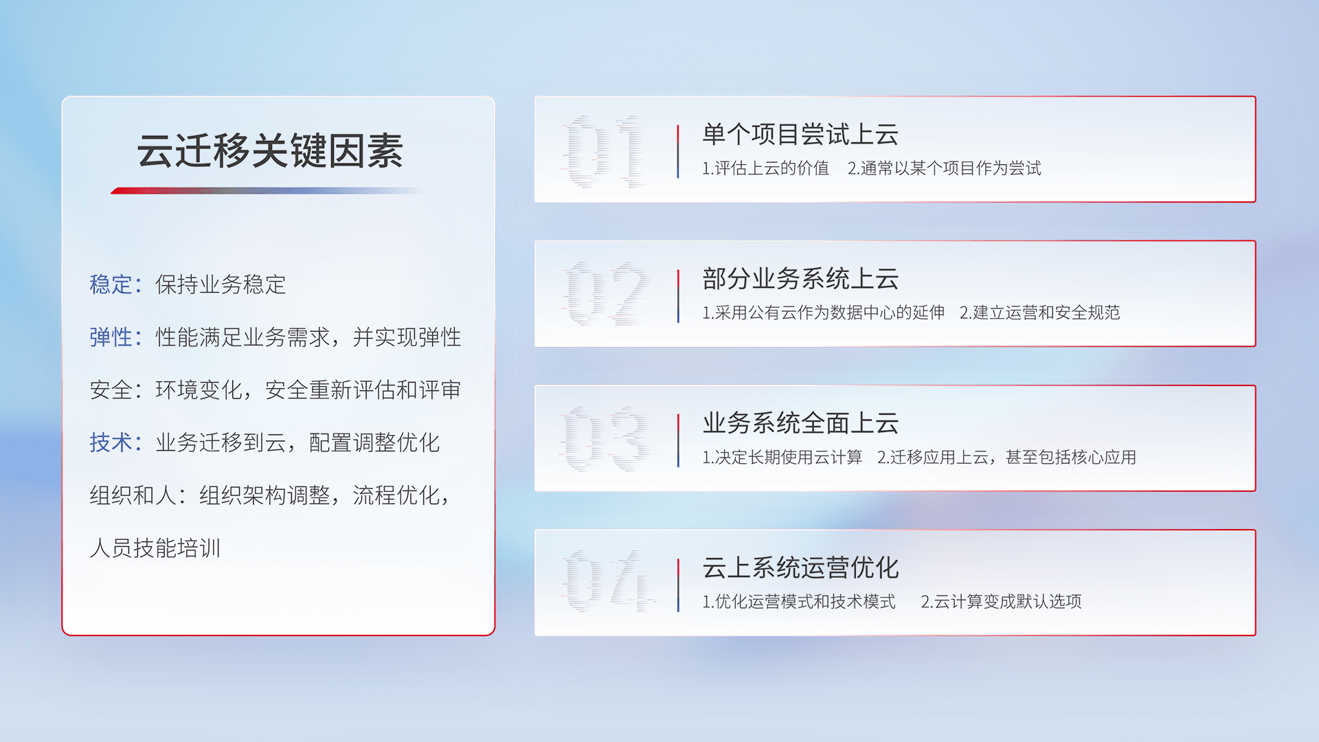结合实际业务,,,从规划设计、、云平台选型、、云原生改造、、数据迁移、、、集成交付,,迁移全过程为客户识别最佳上云路径,,做好风险识别管理,,,设计网络架构、、身份权限、、安全审计合规、、操作审计、、、日志审计、、、、监控告警策略、、多站点容灾设计等,,,,对云上基础设施进行整体规划,,提升IT治理水平,,,,以满足弹性、、高可用、、、高性能的需求。。